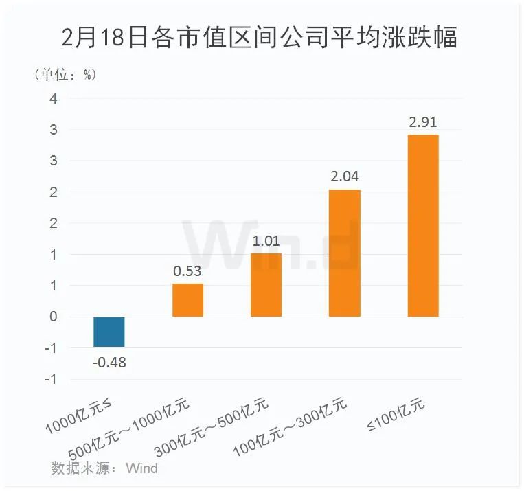 Wind统计显示,市值超过1000亿元的公司,平均跌幅为0.48%;市值在500亿元到1000亿元之间的公司平均涨幅为0.53%;市值在300亿元到500亿元之间的公司平均涨幅为1.01%;市值100亿元到300亿元之间的公司平均涨幅为2.04%;市值小于100亿元的公司平均涨幅为2.91%。