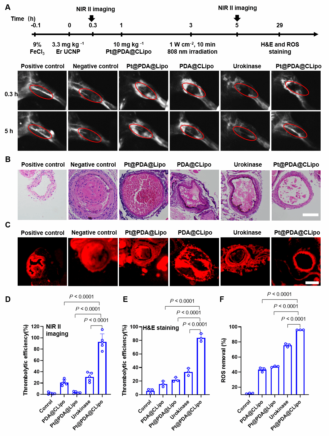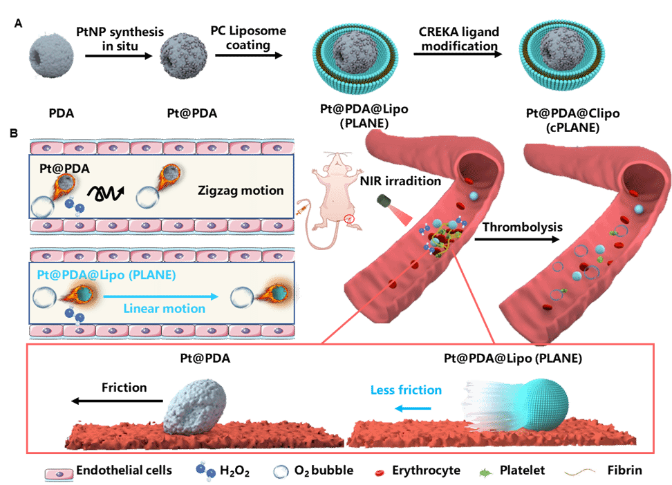 研究人员开发了PLANEs(磷脂酰胆碱脂质体加速的铂纳米机器),具有快速运动能力,能够在近红外(NIR)激光照射下穿透血栓。PLANEs运动的增强归因于其表面上的磷脂酰胆碱脂质体涂层。该涂层减少了固体-液体摩擦,使PLANEs的运动速度超过了铂纳米马达。此外,磷脂酰胆碱脂质体涂层将铂纳米马达从不对称的碗形转变为各向同性的球形,促进了直线运动,进一步提高了其速度。为了增强其体内治疗潜力,研究人员开发了靶向血栓的cPLANEs。这些cPLANEs能够有效靶向并破坏血栓,同时在近红外激光照射下清除过量的活性氧(ROS),实现高效的血栓机械治疗。考虑到非药物血栓治疗方法日益重要,研究提供了通过结合减少摩擦和线性运动与磷脂酰胆碱脂质体涂层,改善纳米马达穿透血栓的策略,从而在不需要溶栓剂的情况下,增强纳米马达的运动行为和治疗效果。该研究建立了一种多功能纳米马达涂层平台技术,使纳米马达在复杂生理环境中能够实现更好的运动行为。