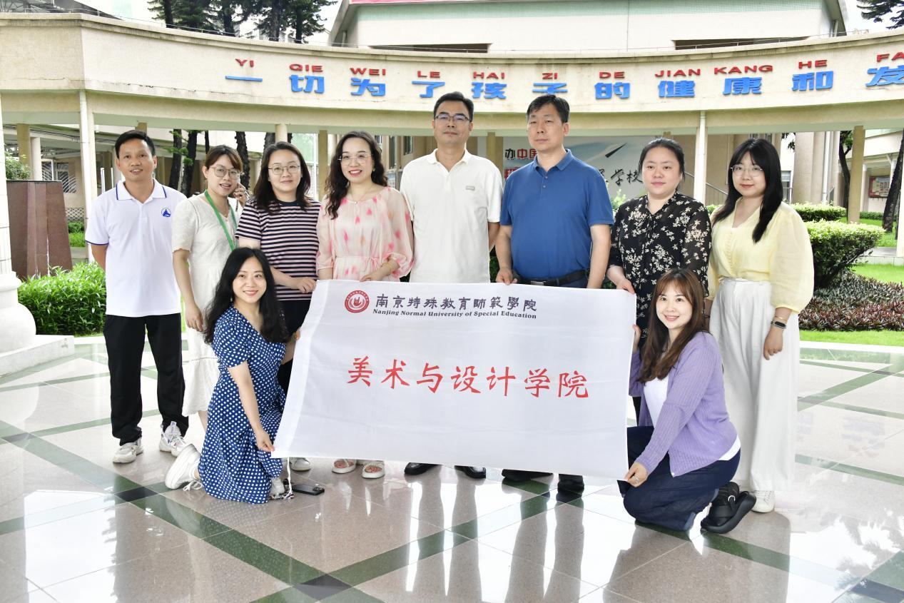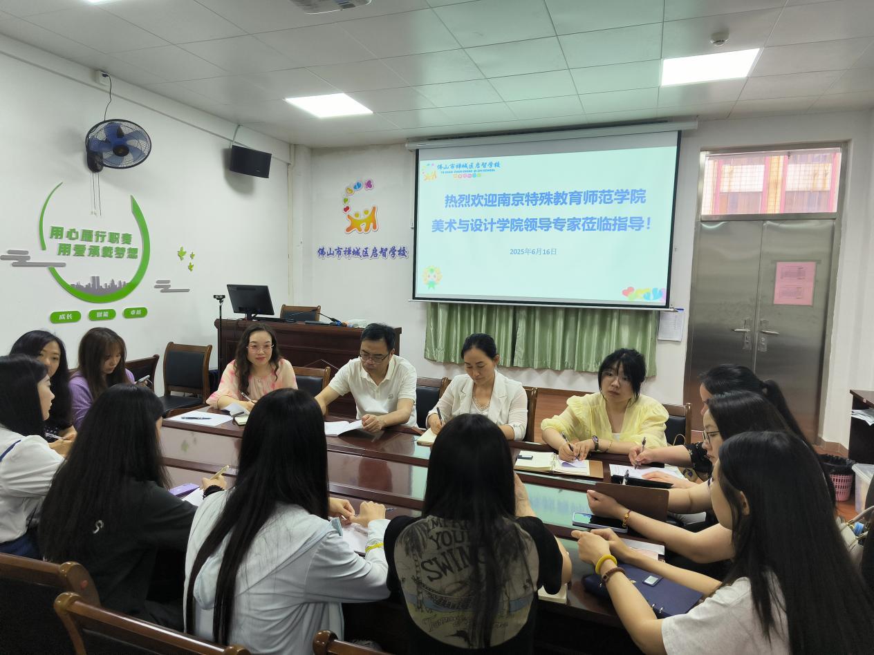 2025年6月16日至19日,南京特殊教育师范学院美术与设计学院院长赵健、副院长李敏带领五位专业教师团队赴广东开展深度调研,先后走访佛山、深圳、珠海三地六所特殊教育学校。此次调研聚焦培智学生艺术教育现状,旨在系统梳理特殊学校美育教学特色经验,重点推进两大核心任务:一是培智学生美育教材的编纂工作,二是“美小圈”美术治疗数智化教学平台的研发与应用。通过实地考察与学术交流,团队积极探索特殊群体美育发展的创新路径。