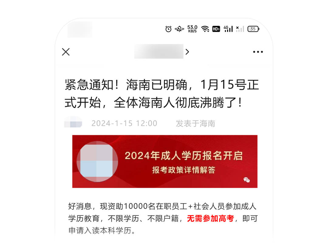标题宣称紧急通知,明确指向“全体海南人”,误导该群体用户以为出台与其相关的政策,而正文实则是教育课程营销广告,也并未限制区域。