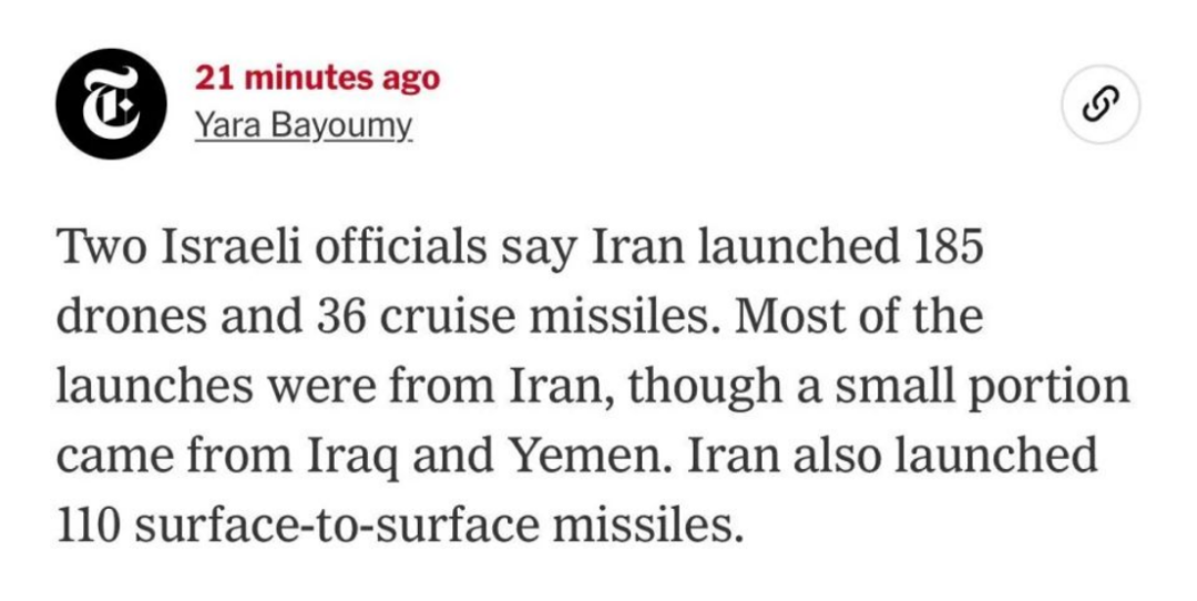 一些阿拉伯媒体称伊朗的报复行动使伊朗被载入史册: 这是伊朗有史以来首次直接攻击以色列,而且伊朗进行了有史以来最壮观的军事行动之一。