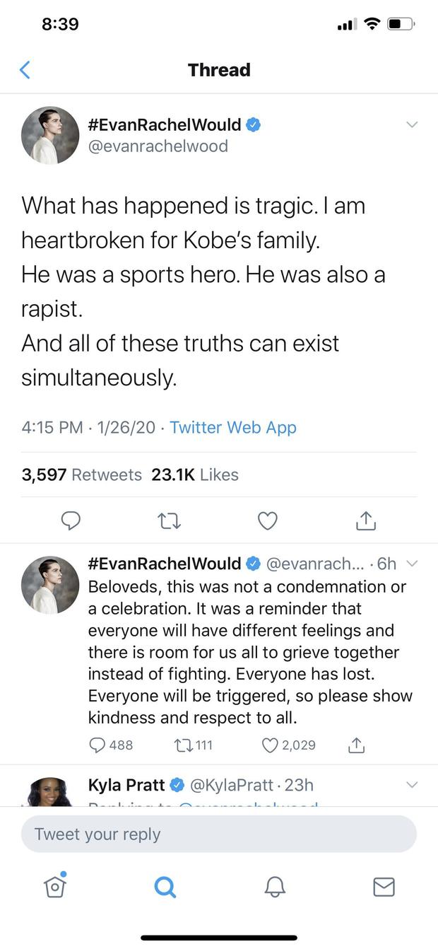 近日, 《西部世界》的女主角埃文·蕾切尔·伍德因在推特上针对此事的争议性言论,引起了轩然大波。她在悲剧发生的几个小时之后发推,“发生的一切是悲剧,我为科比的家人心碎。他是个运动员英雄。他也是个强奸犯。这些事实可以共存。”