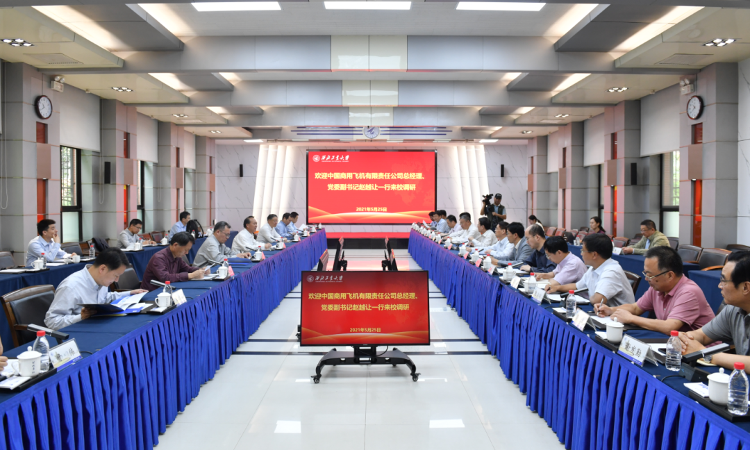 5月25日,中国商用飞机有限责任公司总经理、党委副书记赵越让,党委常委、副总经理郭博智,党委常委、副总经理张玉金,工程总师、科技委常委、ARJ21系列总设计师陈勇,二级专家、科技委常委、CR929型号总设计师陈迎春,办公室主任 张新苗,人力资源部部长沈大立,科技管理部部长叶伟,科技委常委、C919基本型总设计师韩克岑一行来学校调研。