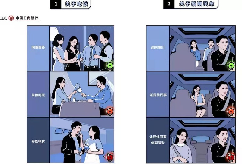 根据网友配图,关于吃饭,工行倡议同事集体聚餐避免异性单独约饭、避免异性喂食;关于搭顺风车,工行倡议避免单独送异性同事或让异性同事坐副驾驶;关于相处时间,工行倡议避免团建、下班后异性单独相处;关于举止行为,工行倡议避免异性过分亲昵或疑似亲密。