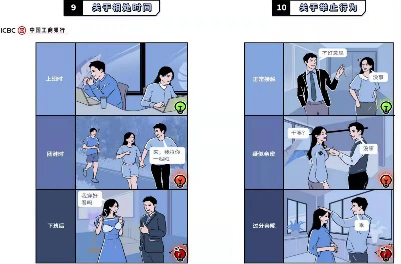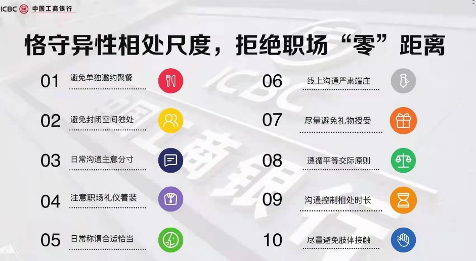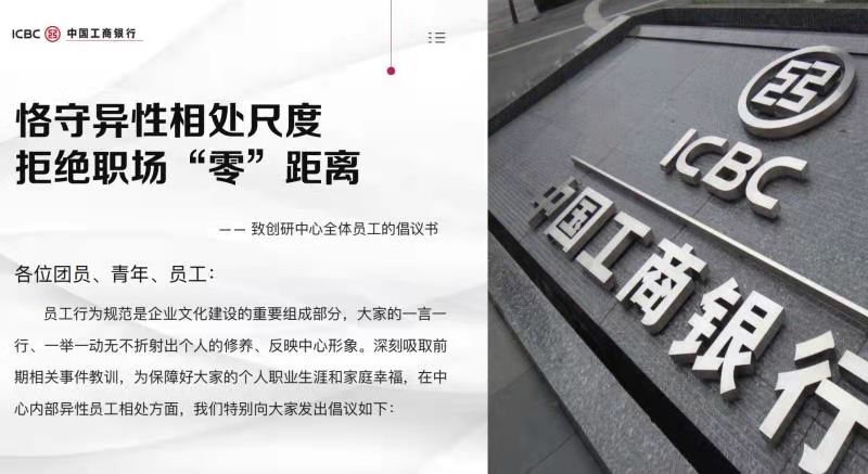 工行表示,为保障好大家的个人职业生涯和家庭幸福,在中心全体异性员工相处方面,特别发出倡议。