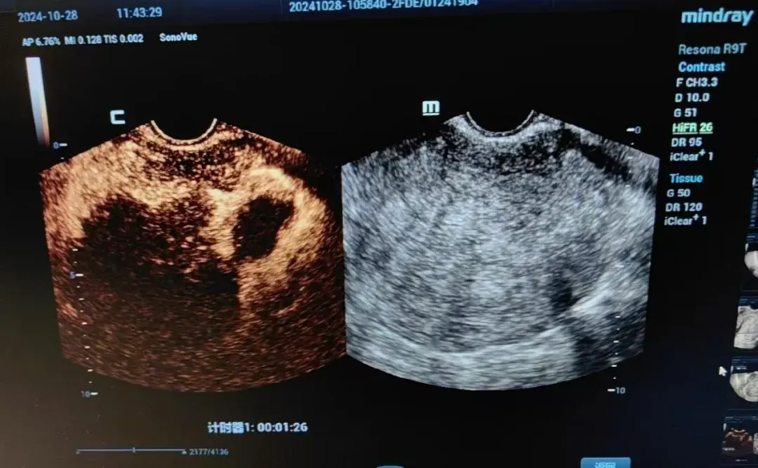 年仅41岁的李女士被子宫腺肌瘤困扰7年多了,有进行性加重的痛经、月经量大、贫血、经常性便秘和尿频等症状。为了治疗这个疾病,李女士四处就医,病程中给予曼月乐环宫腔置入3次(因宫腔过大及月经量过多而脱落),她还用过醋酸亮本瑞林皮下注射,还间断服用过地诺孕素及中药合剂,都没有解决她的痛苦,要完全根治李女士的病症,最彻底的方式是手术切除子宫。然而,对于比较年轻的李女士来说很难接受这种手术方式。经过辗转,李女士来到南京同仁医院妇科门诊找到了万贵平主任。万教授仔细地询问了李女士的病史及其要保留子宫的强烈意愿。由于李女士曾经做过两次子宫下段剖宫产,并且子宫腺肌瘤的病灶位于子宫后壁,最大径线达72mm,经皮及经阴道微波消融极易损伤膀胱直肠及周围组织结构。为了微波消融的精确及安全的进行,万教授为李女士制定了腹腔镜下子宫腺肌瘤微波消融术的手术方案,在腹腔镜及阴道超声引导下行子宫腺肌瘤微波消融。在妇产科、超声科、麻醉科医生的密切配合下,不到1小时就完成了子宫后壁腺肌瘤的消融,术后患者无发热,有轻微的下腹痛。术后5天行超声造影显示腺肌瘤坏死体积达90%,手术非常成功,李女士保住了自己最珍视的子宫,满怀感激的出院了。
