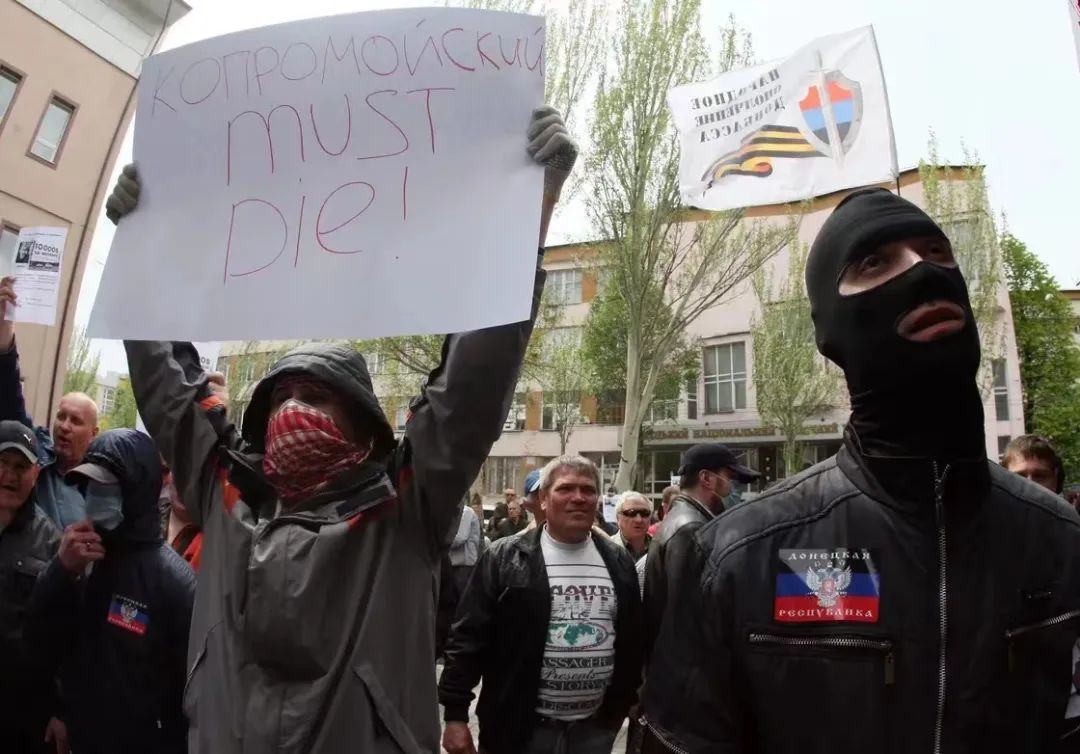 ▎科洛莫伊斯基2014年4月,约300名戴面具的亲俄分子挥舞着棒球棍袭击了科洛莫伊斯基位于乌克兰顿涅茨克的私人银行,一名示威者举着标语牌:“科洛莫伊斯基必须死!” 图源/POLITICO