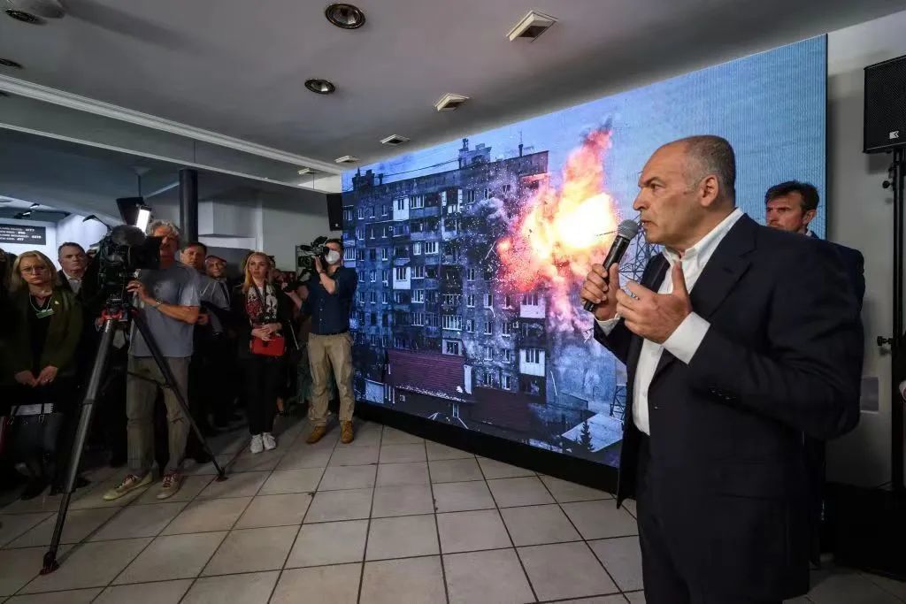 ▎2022年5月23日,达沃斯世界经济论坛年会期间,乌克兰商人兼寡头维克多·平丘克在“俄罗斯战争犯罪之家”展览开幕式上发表演讲 图源/News.artnet.com