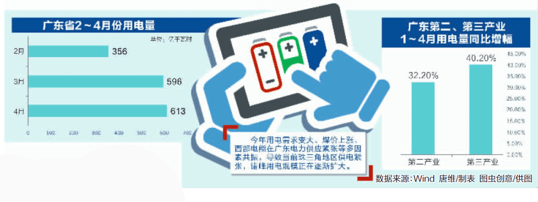 用电数据是经济发展的“晴雨表”和“温度计”。今年以来,我国经济持续稳定恢复,全社会用电量快速增长,4月达到6361亿千瓦时,同比增长13.2%,较2019年同期增长15%。作为我国经济大省,广东第二、第三产业用电需求持续旺盛,1~4月用电量同比分别增长32.2%和40.2%。用电增长太快,是珠三角地区用电紧张的重要原因。