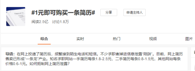 2019年9月,微博话题#1元即可购买一条简历#冲上热搜,阅读量达2.5亿。媒体报道称,知名求职网站一手简历每条1.8-2.5元,二手简历每条0.8-1.5元,其它网站每条0.6-1元。