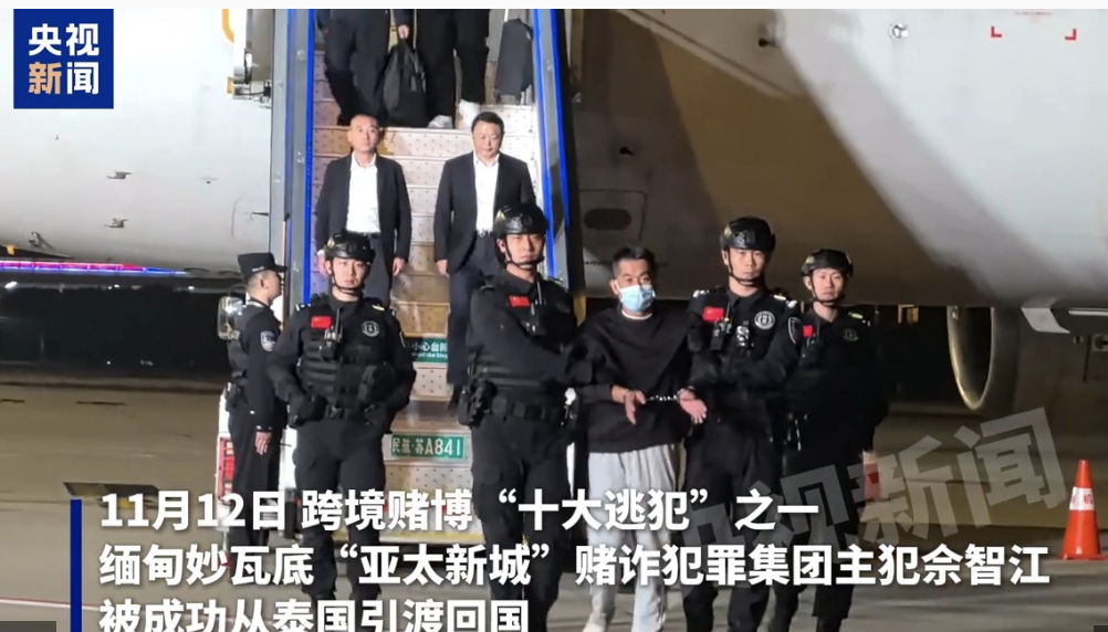 11月12日,随着一架中国民航客机降落在南京禄口国际机场,我公安机关通缉的跨境赌博“十大逃犯”之一、缅甸妙瓦底“亚太新城”赌诈犯罪集团主犯佘智江被成功从泰国引渡回国。