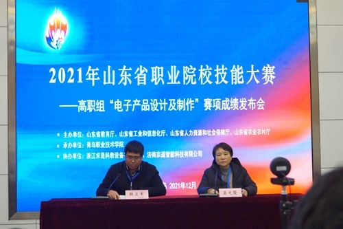12月10至11日,由山东省教育厅、山东省工业和信息化厅、山东省人力资源和社会保障厅、山东省农业农村厅主办,青岛职业技术学院承办的2021年山东省职业院校技能大赛高职组“电子产品设计及制作”赛项在我校顺利举办。来自全省高职院校、技师学院的28支代表队的84名选手参加了此次比赛。在青岛职业技术学院教师修娜、王靓指导下,青岛职业技术学院信息学院2020级应用电子技术专业学生吴庆法、杨栋斌、吴佳菲组成的团队最终获得比赛第一名。青岛职业技术学院副院长张旭鹏、乔璐到比赛现场进行巡查。