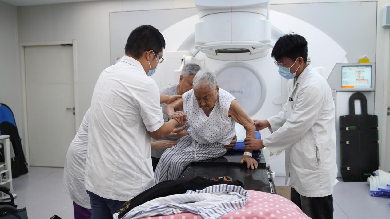 据放射治疗部技师周霞介绍,团队会为每一位患者制定个性化的放疗流程,确保从定位、躺上治疗床到治疗,每一步都精准。对高老这样的高龄患者,更是格外关注上心。医护人员会非常仔细地给她做好皮肤标记,避免反复涂抹带来不适;在安排治疗时间时,会优先考虑老人,并且特意把她的治疗都安排在白天,不用老人晚上来回奔波减少风险。治疗室里,考虑到老人上下床不便,特意准备了台阶;每次治疗时,都有专人在旁边小心搀扶,辅助她平稳地躺到治疗床上,整个过程既保证了治疗的精准性,也尽量让老人感到舒适省力。