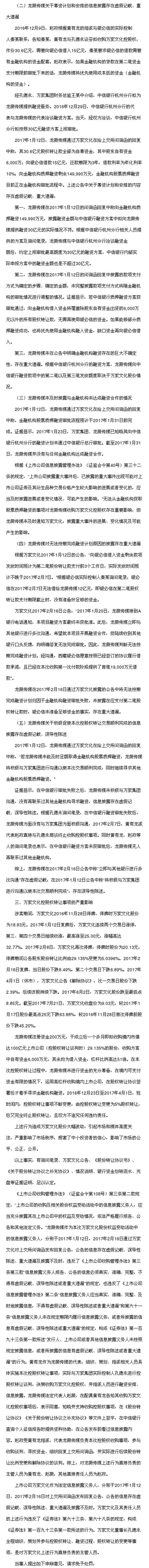 证监会:在案事实和证据足以表明,黄有龙组织、策划、指派相关人员具体实施本次控股权转让事项,实际与孔德永进行控股权转让谈判,决策收购万家文化控股权,并指派人员进行融资安排、信息披露,知悉并决策本次收购的进展情况,了解两份回复公告所涉内容。