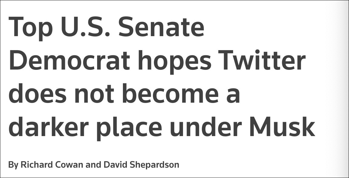 民主党参议员伊丽莎白沃伦称马斯克的收购是“危险的”......“像埃隆马斯克这样的亿万富翁遵循一套与其他人不同的规则,为自己的利益积累权力。我们需要财富税和强有力的规则来追究大型科技公司的责任。 "