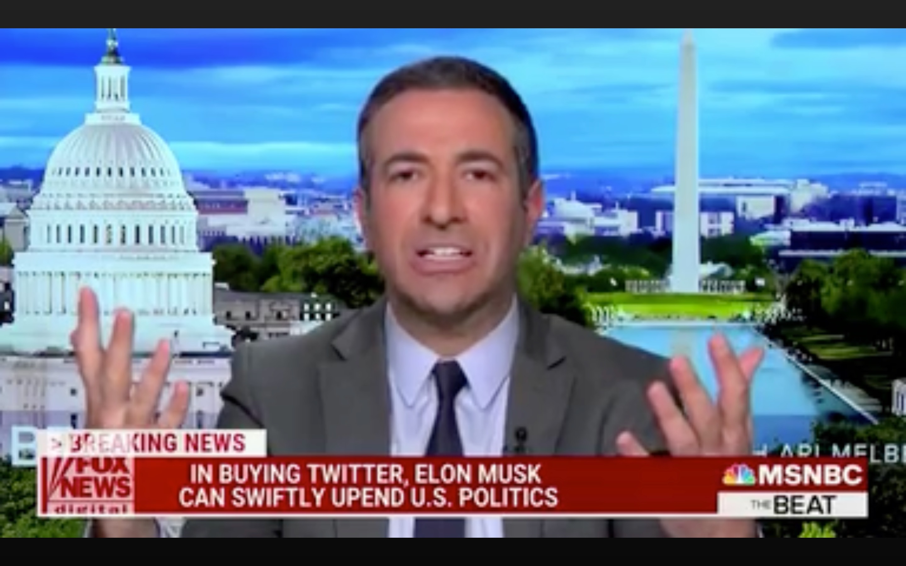 据福克斯新闻4月26日报道,微软全国广播公司(MSNBC)主持人阿里·梅尔伯(Ari Melber)25日对马斯克收购Twitter提出了一个有争议的看法:担心马斯克可能会在大选前利用Twitter“倾斜选举”,压制言论。暗示或为右翼的马斯克收购Twitter后,左翼民主党将受压制。