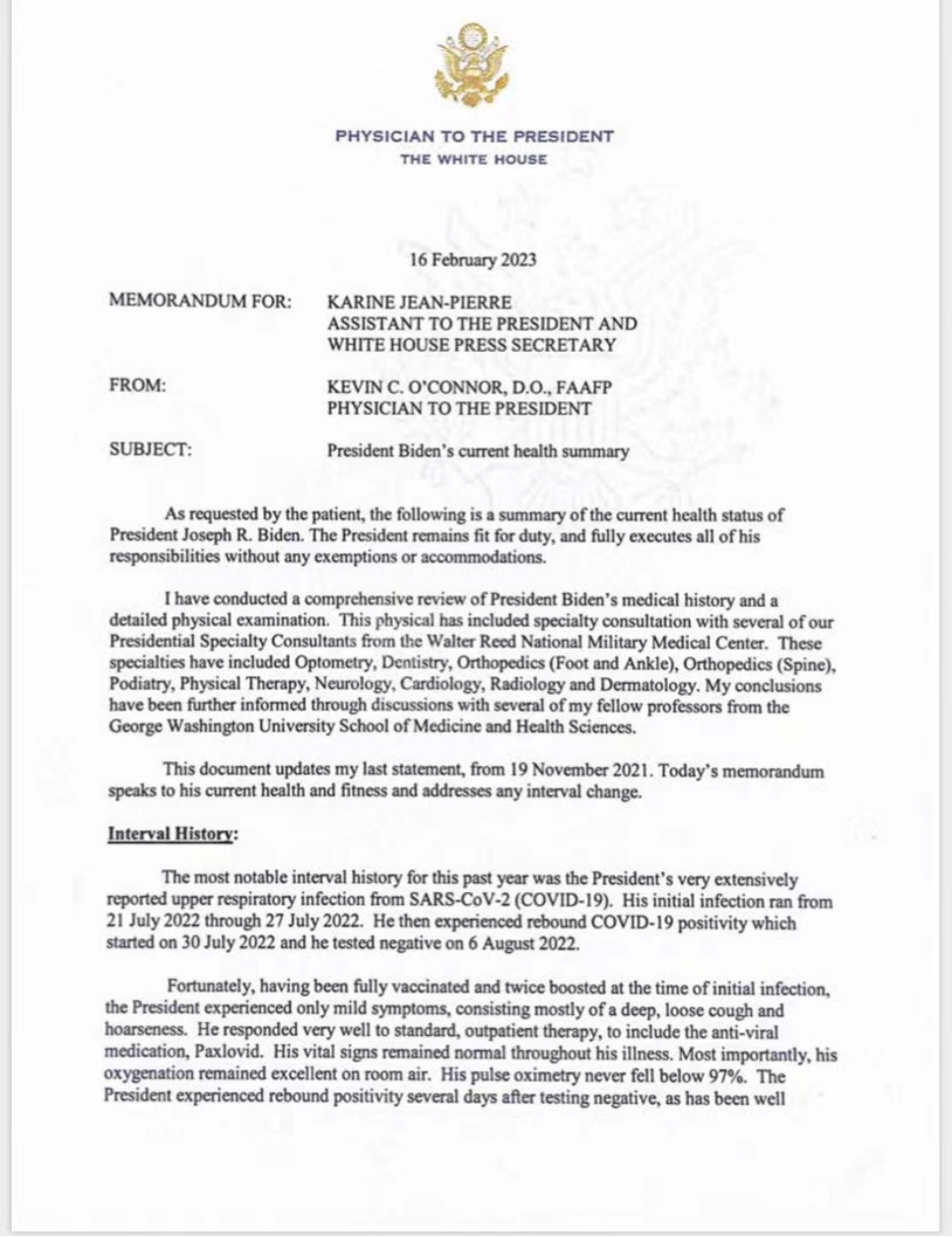 白宫在数小时后发布了体检报告,签发人为总统医疗团队主管凯文·奥康纳(Kevin O’Connor),他此前15年间一直担任拜登的私人医生,对其病史和用药史有深入了解,拜登2021年的体检报告也是奥康纳完成的。