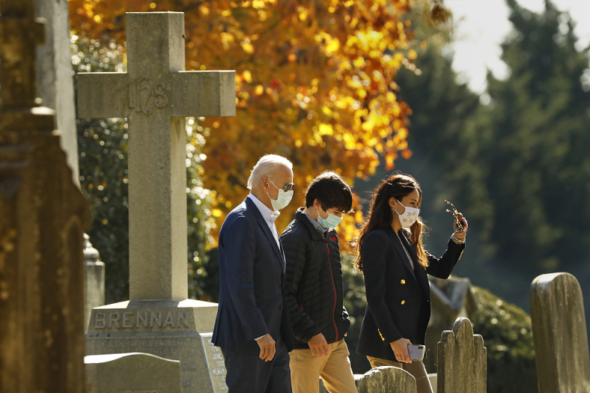 ▎图/当地时间2020年11月8日,美国特拉华州威尔明顿,拜登在家人的陪同下到家族墓地,给已故长子博·拜登扫墓。
