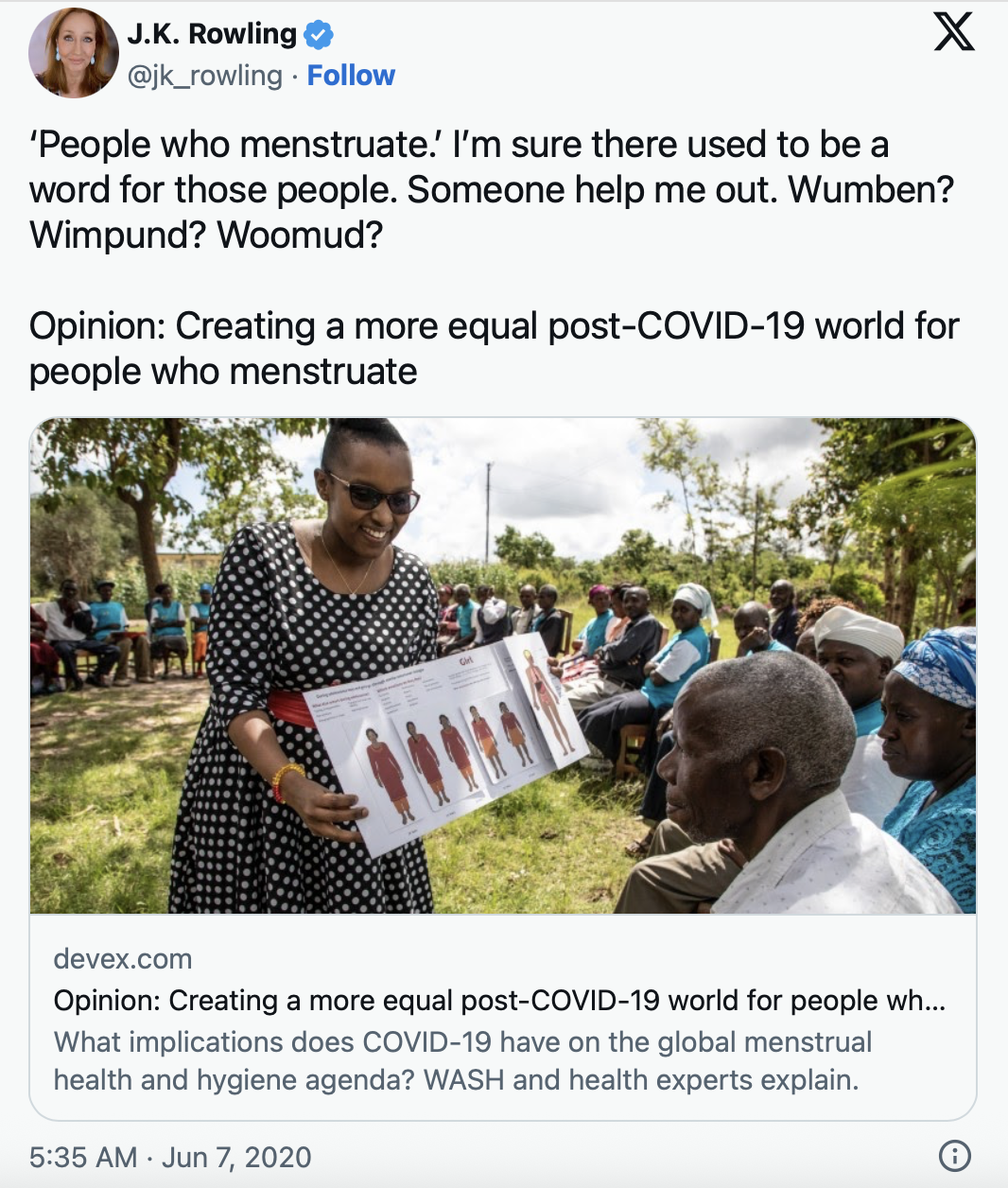 当时J.K.罗琳在社交媒体上发文,对「有月经的人」这一短语提出批评,认为这模糊了「女性」一词的定义。