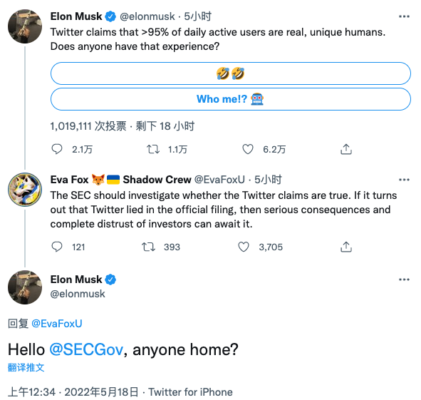鞭牛士 5月18日消息,当地时间周二,有推特用户建议SEC调查推特真实用户数的问题。马斯克回复道,推特公司声称95%的日活跃用户是真实的、不重复的,“SEC有人核实一下吗?”