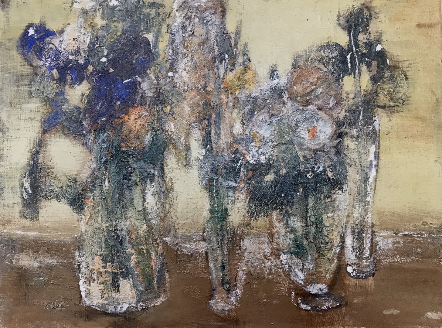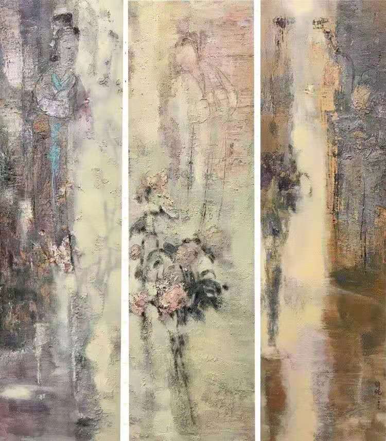 赵纯 亚麻布油彩《穿越·聆听》120X35cmX3