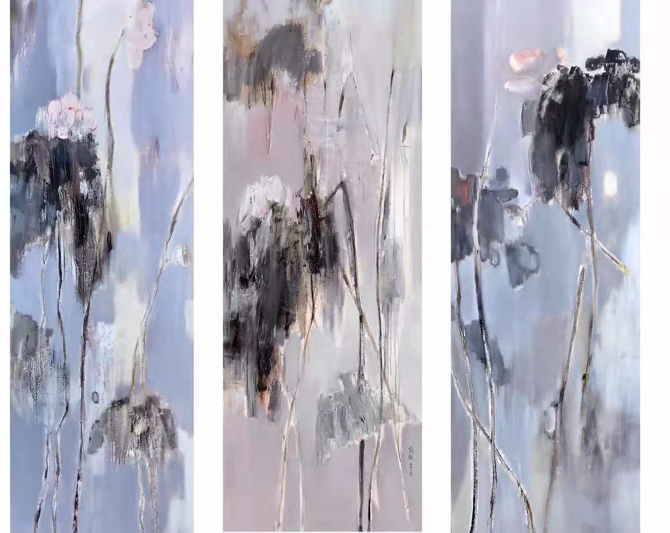赵纯 亚麻布油彩《秋塘·雨声》243X85cmX3