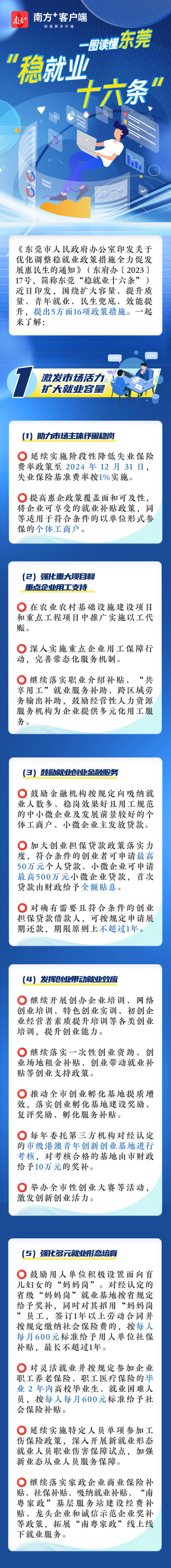 稳就业就是促发展、惠民生,东莞出实招、解难题。近日,东莞市人民政府办公室印发《关于优化调整稳就业政策措施全力促发展惠民生的通知》(东府办〔2023〕16号,下称东莞“稳就业十六条”),从激发市场活力,扩大就业容量;增强职业技能,提升就业质量;拓宽就业渠道,促进青年就业;优化精准服务,兜牢民生底线;完善“就莞用”,提升服务效能五个方面提出16条举措,全力做好就业“大文章”。