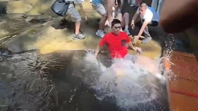极目新闻记者注意到,张继科在直播中说,他们一行有十多个人,但里面(九龙洞附近)比较小,大家都进去以后,他先拍照。他拍完后,蹲在岸边给朋友拍照,“不知道被谁一脚踹水里了,其实那地方已经很滑了。”