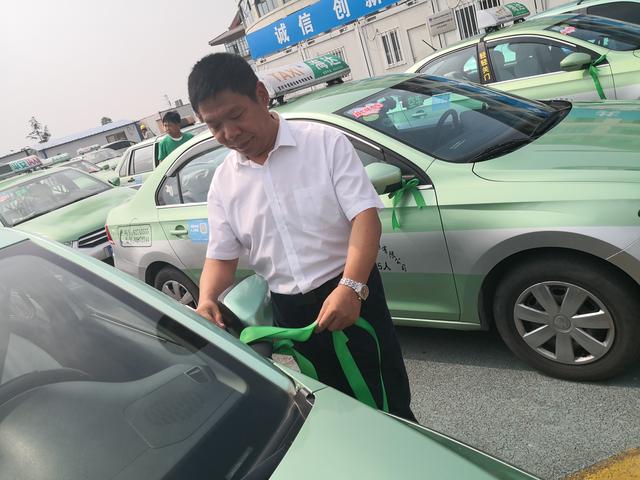 在活动现场,景志杰会长为出租车和爱心车辆佩戴爱心车贴和绿丝带。