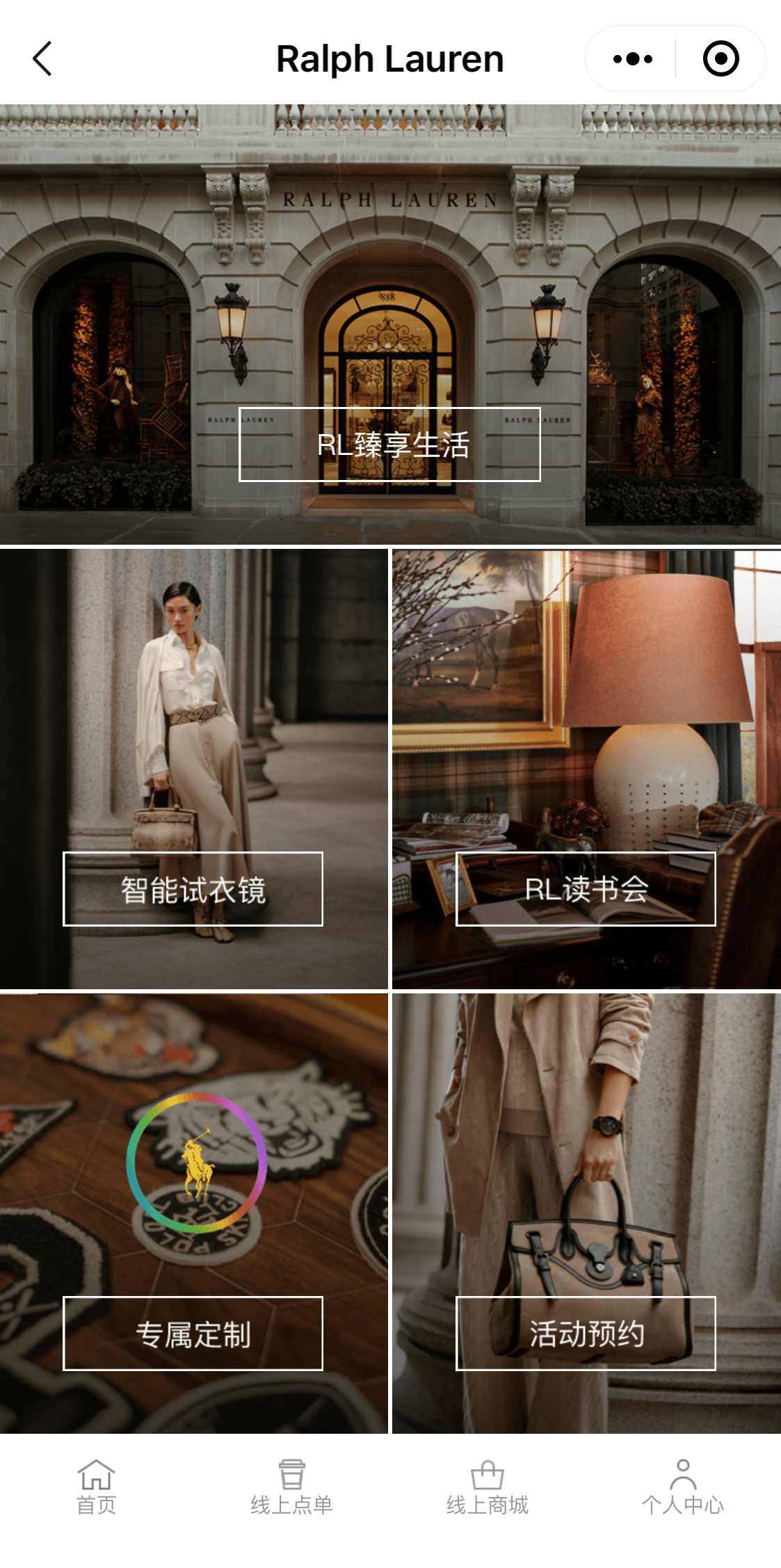 小程序首页呈现了三大模块,包括店内功能区域和线上体验的“拉夫劳伦之家”、“Ralph’s Coffee”和“Ralph Lauren官方商城”小程序入口。