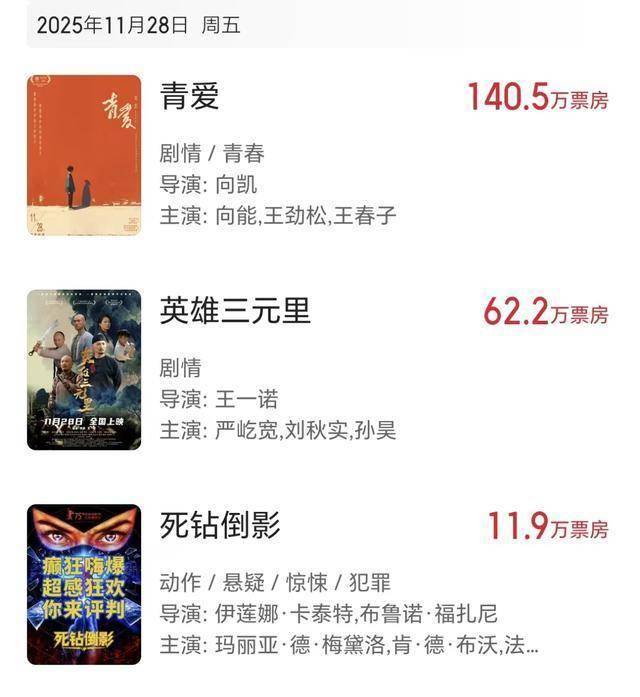 向能和王劲松联合主演的《青爱》成功夺冠,严屹宽新片《英雄三元里》票房只有60万人民币。