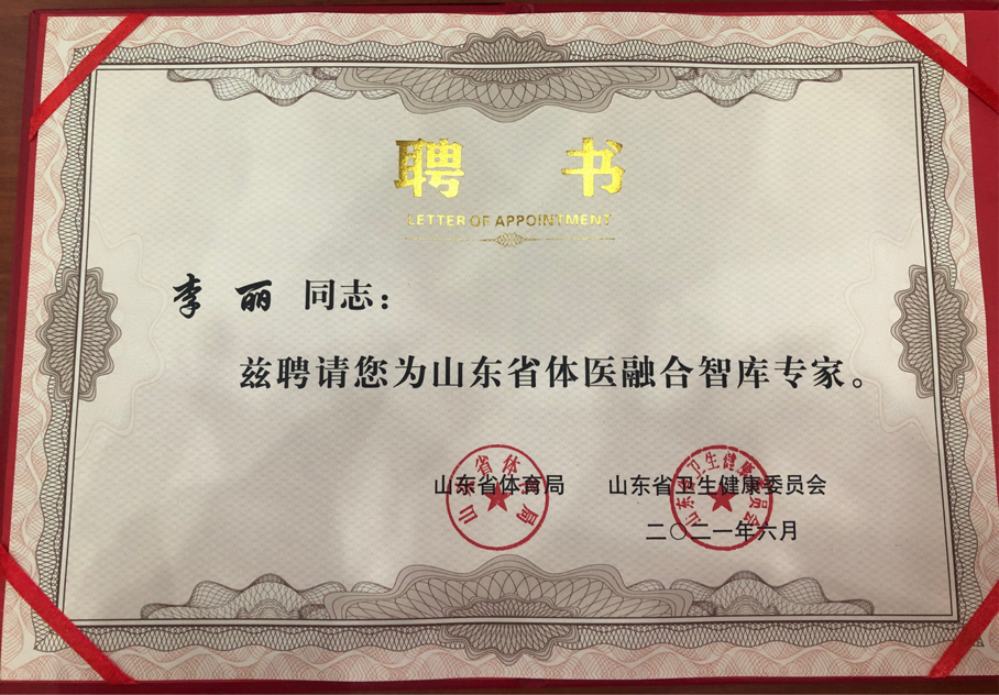 山东中医药大学第二附属医院康复医学科主任李丽教授受邀出席本次会议。李丽主任作为知名专家学者被聘为山东省体医融合智库专家。李丽教授团队申请的“体医融合防治颈肩腰腿痛”成为首批山东省体医融合试点项目。在今后的工作中李丽教授将率领团队开展体医融合领域理论和建设模式等相关工作的研究。(通讯员 吕奕)