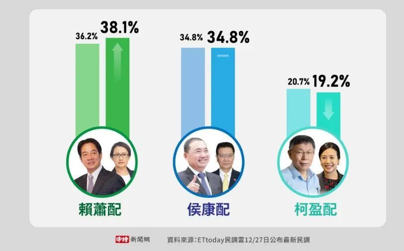 ▎ 2023年12月26日,第二场候选人电视政见发表会举行。27日公布最新民调显示民进党候选人赖清德跟国民党候选人侯友宜之间的差距,从1.4个百分点扩大到3.3个百分点。