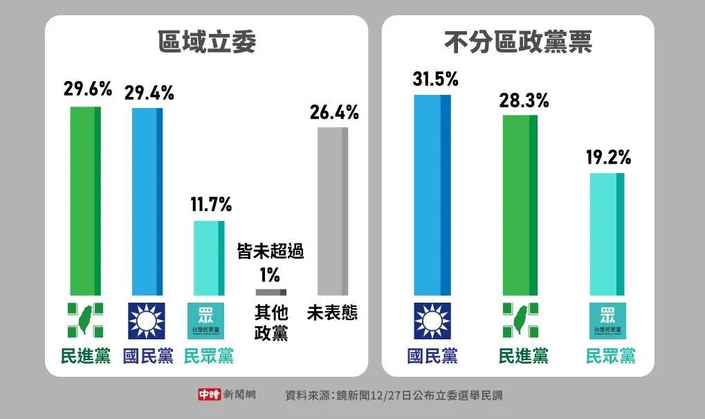 ▎图为“镜新闻”公布2023年12月27日最新民调,截至目前,仍未有政党支持率超过半数。