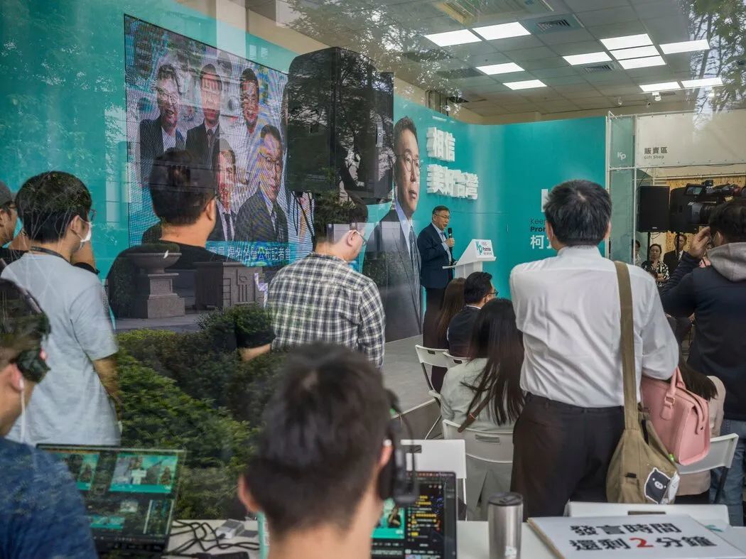 ▎台湾民众党候选人柯文哲上个月出席了台北的一场新闻发布会。他在最近的民调中有所下滑,但仍可能通过吸纳年轻选票发挥决定性作用。