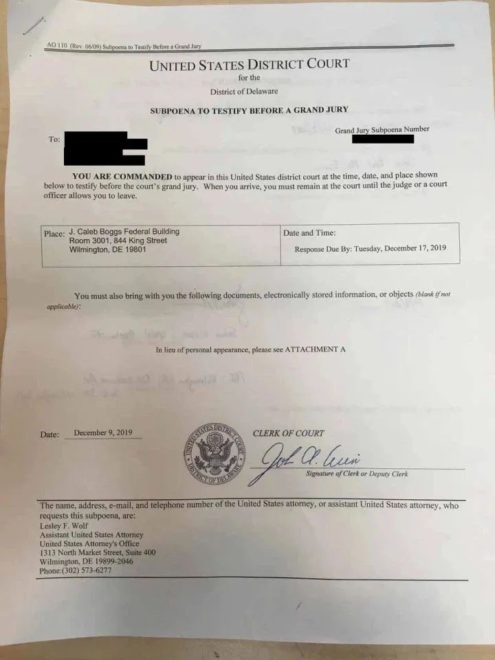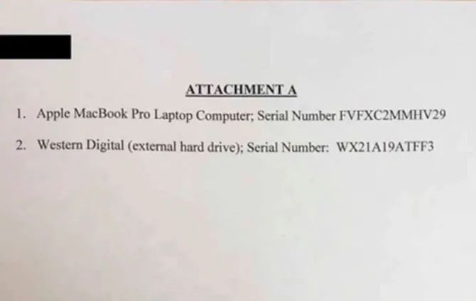 据信FBI巴尔的摩办事处于2019年12月获取了当中一台电脑和硬盘,FBI还提供了下列收据,列明了查抄的笔记本电脑和外接硬盘的序列号。