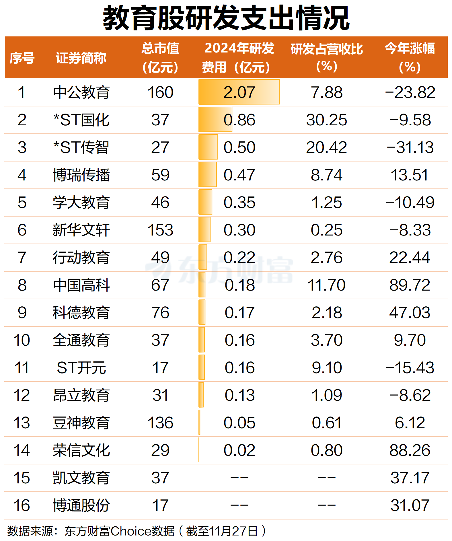 据东方财富Choice数据,目前A股教育板块个股共计16只,从披露的2024年研发支出情况看,中公教育研发费用最高,达2.07亿元,研发费用占到了该年营收的7.88%;其次是*ST国化,为0.86亿元,占该年营收的比例为30.25%;*ST传智第三,为0.5亿元,占该年营收的比例为20.42%。