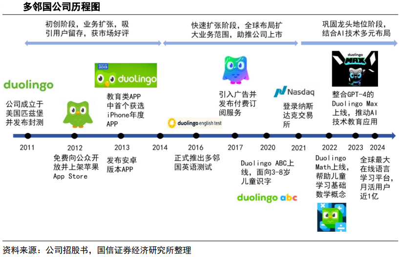 国信证券研报显示,多邻国是由“验证码之父”LuisvonAhn及其博士生SeverinHacker于2011年联合创立的教育科技公司。2021年7月末,公司在美股上市,最新总市值为87.11亿美元(约617亿元人民币)。
