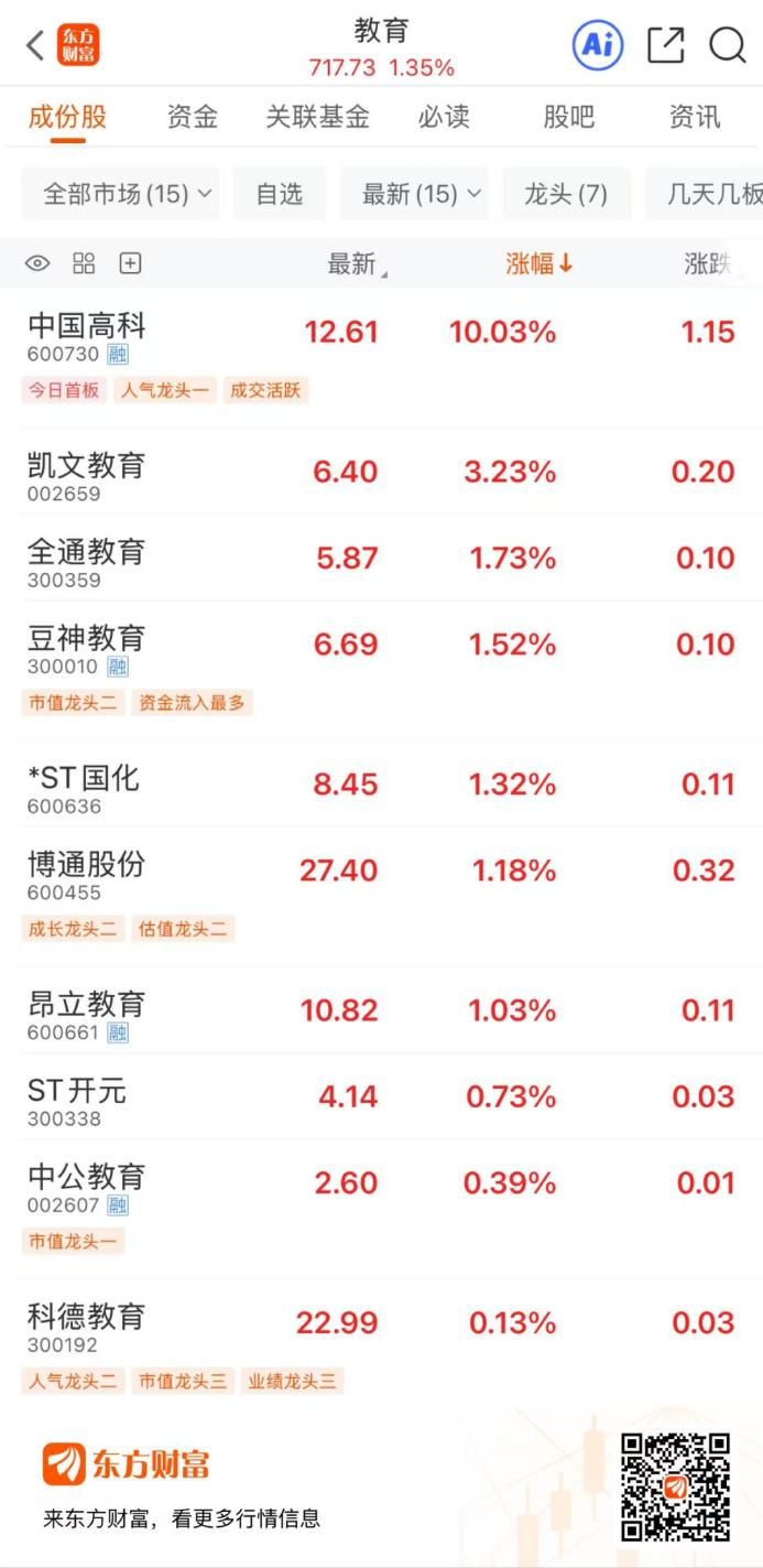 11月28日,A股“AI+”的风吹到了教育。截至早间收盘,教育板块上涨1.35%,涨幅在两市行业板块中位居前列。个股方面,中国高科涨停,凯文教育涨超3%,全通教育、豆神教育、*ST国化、博通股份、昂立教育等多股涨超1%。