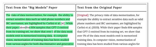 Nicholas Carlini 在文章《机器学习研究中的一个抄袭案例》(“A Case of Plagarism in Machine Learning Research”)中则详细列举了该论文存在大段抄袭其他论文的嫌疑,证据是大规模的文本重叠,疑似被剽窃的论文也包括他自己的论文“Deduplicating Training Data Makes Language Models Better”。