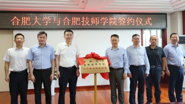 6月24日,合肥大学与安徽合肥技师学院签约暨人才联合培养基地揭牌仪式在行政楼九楼东会议室举办,合肥市副市长何逢阳,合肥市人力资源与社会保障局党组书记、局长徐生彬,党组成员、副局长任清智,安徽合肥技师学院党委书记、院长程长风,党委委员、副院长姜玉茹,合肥大学党委副书记、校长任永,党委委员、副校长王晓峰出席仪式,仪式由王晓峰主持。