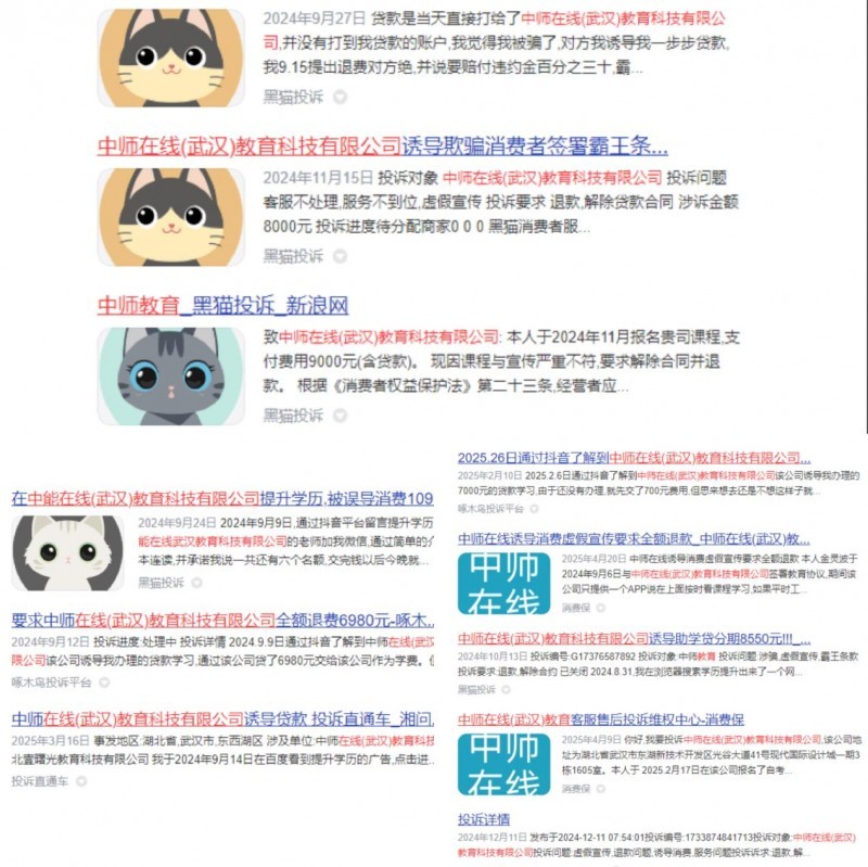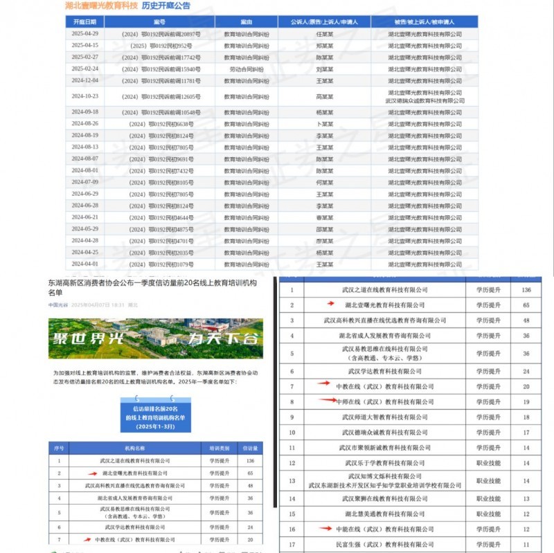 武汉讯 近日,湖北壹曙光教育科技有限公司及其旗下关联企业中教在线(武汉)教育科技有限公司、中师在线(武汉)教育科技有限公司、中教在线(武汉)教育科技有限公司等司因涉嫌诱导消费者贷款参加培训业务,持续占据武汉东湖高新区消费者协会信访量榜首。网上调查发现,尽管该企业投诉缠身,却仍在正常运营并获批设立多所培训学校,引发社会广泛关注。