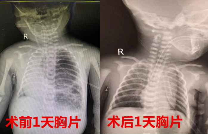 4月15日患儿母亲孕36+5周按计划在我院行剖宫产,出现了新生儿科医生上手术台,小儿外科医生在台下接生的特殊场面。宝宝顺利出生,马上气管插管,上呼吸机,病情评估,一切有序进行。小儿肺脏外科团队、妇产科、麻醉科、手术室、新生儿科组成的MDT团队齐心协力成功地完成了整个治疗过程的第一阶段。