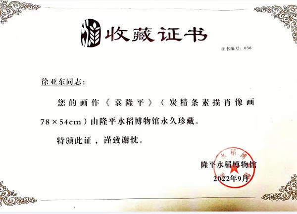 2022年9月7日,是袁隆平院士诞辰92周年。徐亚东先生怀着无比崇敬的心情,将这幅精心之作捐赠予湖南长沙隆平水稻博物馆,完成了自己的心愿,画作被隆平水稻博物馆永久收藏。