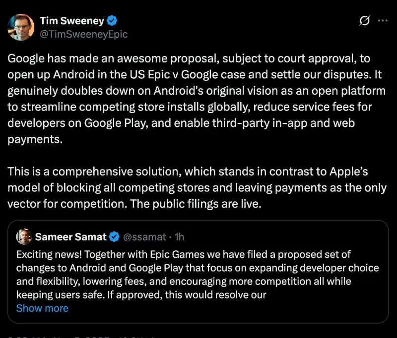 Epic首席执行官Tim Sweeney同日在X上发文,对该提案给予积极评价,称其为“一次全面且有意义的解决方案”,能够推动Android回归开放平台的初衷。据Sweeney透露,提案内容将允许第三方应用商店更便捷地在全球范围内安装,并支持开发者使用自有支付或网页支付渠道,同时对Play商店的服务费结构进行调整。
