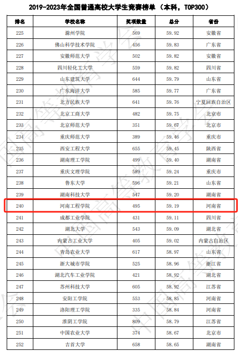 近日,中国高等教育学会高校竞赛评估与管理体系研究专家工作组发布《2023全国普通高校大学生竞赛分析报告》(以下简称《分析报告》),河南工程学院在《2019—2023年全国新建本科院校大学生竞赛榜单(TOP100)》中位列全国第20位、河南省第2位。
