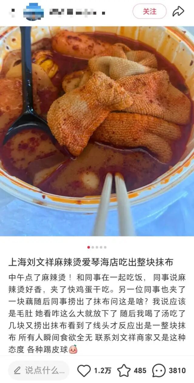 10月28日中午,有网友发帖称其在刘文祥麻辣烫上海爱琴海店点的外卖中,吃出了整块抹布。“看到了线头才反应出是一整块抹布,所有人瞬间食欲全无。”对此,门店工作人员称,监控视频中并未发现餐品中混入抹布的相关画面,目前正考虑报警处理。