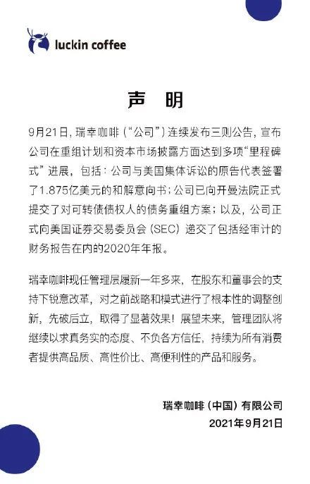 9月21日晚间,瑞幸咖啡连发三条公告,除了补发2020财年年报外,还称已经和美国投资者达成和解协议。
