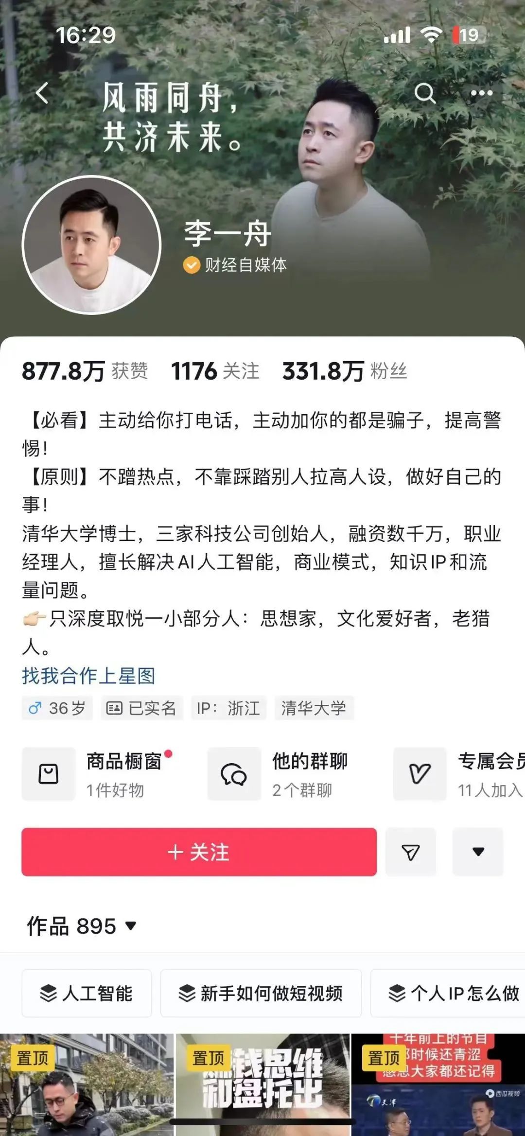 作为销售AI课程的代表之一,李一舟何许人也?他的抖音介绍贴了几个标签:清华大学博士,三家科技公司创始人,融资数千万,职业经理人,擅长解决AI人工智能,商业模式,知识IP和流量问题。