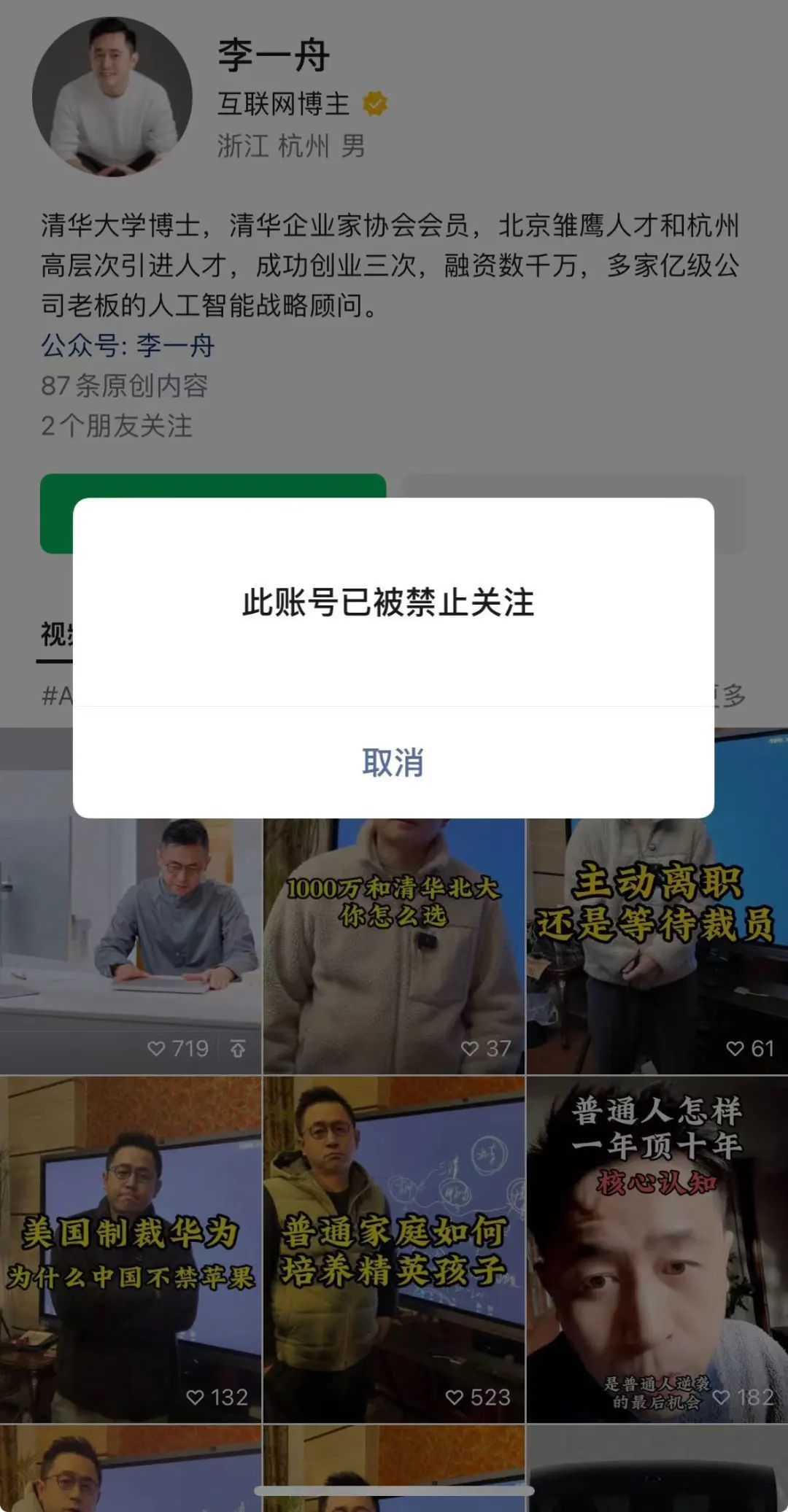 另外,记者还发现,李一舟的个人视频号现已被禁止关注。不过,其官方视频号“李一舟AI”仍然可以关注。